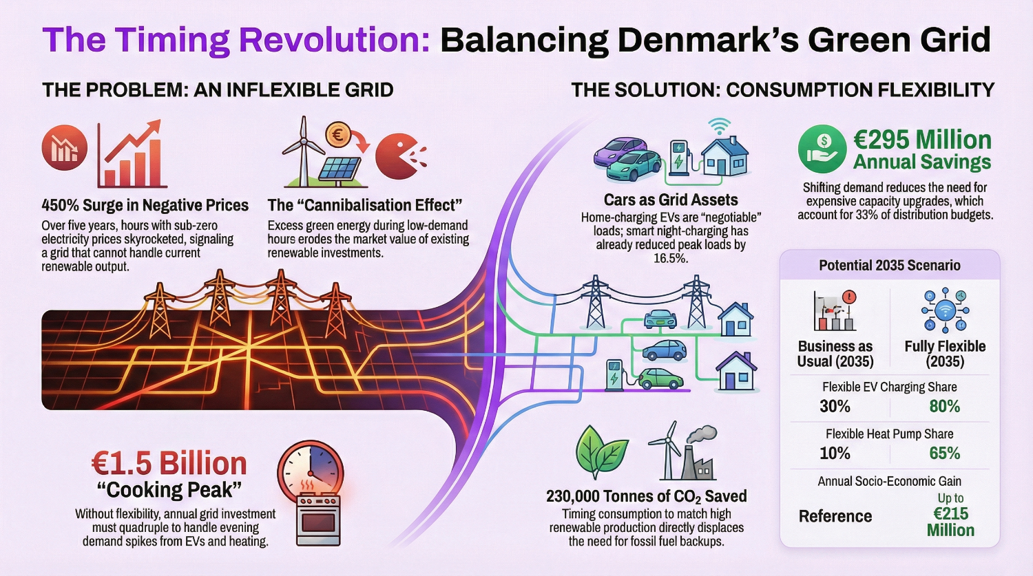 Over the past five years, the number of hours during which Danish electricity prices have dropped below zero has increased by 450%. This may sound like a win for consumers. In fact, it is a structural warning signal. It shows that a grid designed for the fossil fuel era cannot handle the amount of renewable energy that is produced today. According to a major 2025 analysis by Copenhagen Economics and the CIP Foundation, the solution does not lie in installing more turbines or larger cables. Rather, it is a wholesale transformation in how and when Denmark consumes power. This shift is estimated to be worth up to DKK 1.6 billion a year.