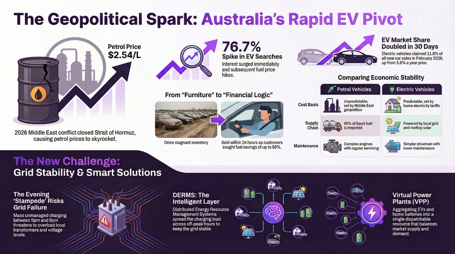 Australia did not become an electric vehicle country because of a politician's speech or a car company's marketing campaign. It happened at a petrol station in March 2026, when the price on the display made the decision for millions of people. The question now is whether the grid, and the companies smart enough to manage it, can keep up.